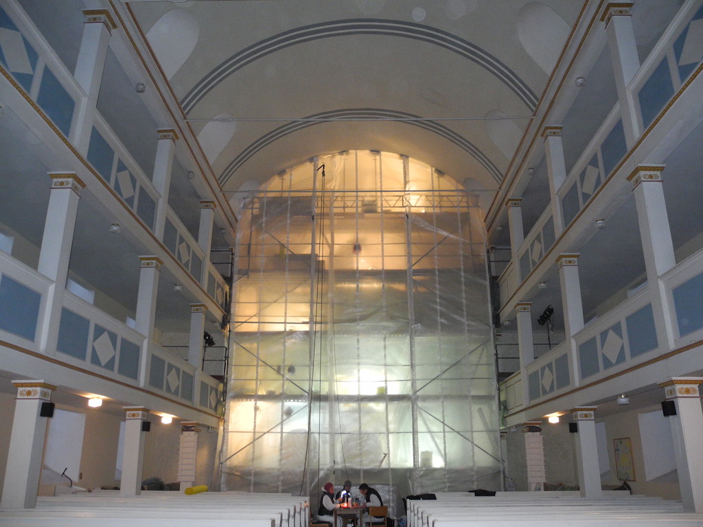 Seit November befand sich in der Kirche ein Gerüst mit einer dicken Folie bis zur Gewölbedecke an der Ostwand. Restauratoren überlisteten mit Heizgeräten den Winter in der kalten Kirche um bis Ende Februar fristgerecht einen ersten Abschnitt der geplanten Restaurierung des Kircheninnenraumes fertigzustellen. Im letzten Quartal 2015 waren von der Beauftragten der Bundesregierung für Kultur und Medien und der Thüringer Staatskanzlei, Fördermittel aus dem Programm “ Invest Ost“ bereitgestellt worden. Nun ist die gesamte Ostwand mit Chorbogen und Apsisgewölbe im historischen Putz wieder restauriert, und der Kanzelaltar hat sich einer der Bauzeit von 1826 zugrundeliegenden Gestaltung beeindruckend angenähert. Dazu haben auch überraschende Befunde aus der damaligen Zeit und deren wissenschaftliche Untersuchungen beigetragen. Die beiden Nischen neben der Kanzel tragen erneut, die den Senioren noch bekannten Psalmtexte: „Dein Wort ist meines Fußes Leuchte und ein Licht auf meinen Wegen“.