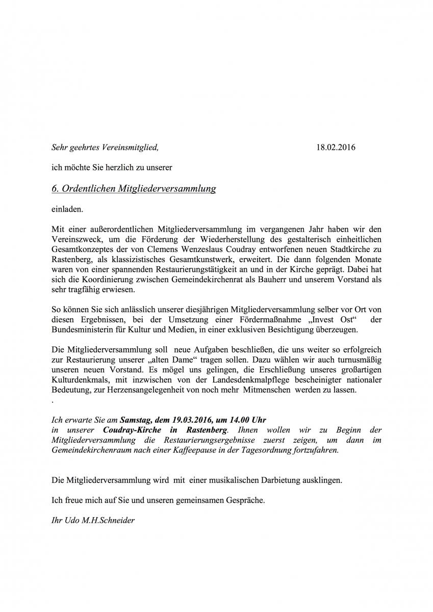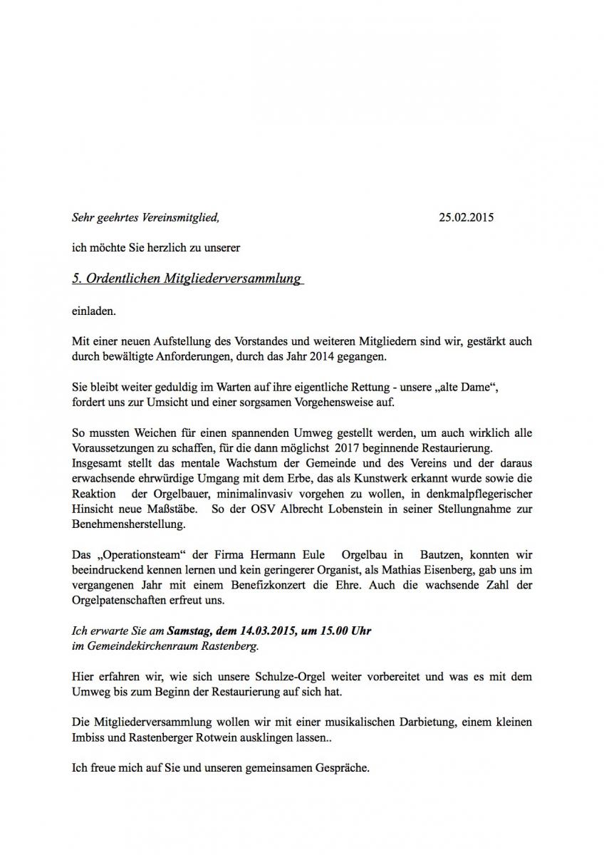 Am 25.03.2017 findet um 14.00 Uhr im Kirchgemeindenraum Rastenberg die 5. Mitgliederversammlung in Rastenberg statt.
