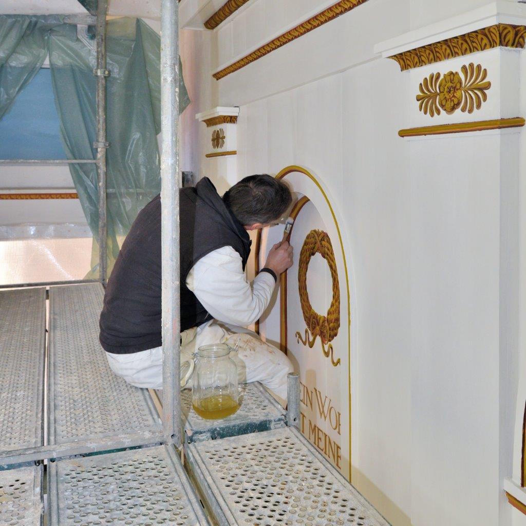 Seit November befand sich in der Kirche ein Gerüst mit einer dicken Folie bis zur Gewölbedecke an der Ostwand. Restauratoren überlisteten mit Heizgeräten den Winter in der kalten Kirche um bis Ende Februar fristgerecht einen ersten Abschnitt der geplanten Restaurierung des Kircheninnenraumes fertigzustellen. Im letzten Quartal 2015 waren von der Beauftragten der Bundesregierung für Kultur und Medien und der Thüringer Staatskanzlei, Fördermittel aus dem Programm “ Invest Ost“ bereitgestellt worden. Nun ist die gesamte Ostwand mit Chorbogen und Apsisgewölbe im historischen Putz wieder restauriert, und der Kanzelaltar hat sich einer der Bauzeit von 1826 zugrundeliegenden Gestaltung beeindruckend angenähert. Dazu haben auch überraschende Befunde aus der damaligen Zeit und deren wissenschaftliche Untersuchungen beigetragen. Die beiden Nischen neben der Kanzel tragen erneut, die den Senioren noch bekannten Psalmtexte: „Dein Wort ist meines Fußes Leuchte und ein Licht auf meinen Wegen“.